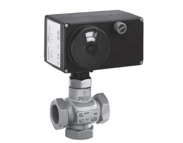 Type 3226 Three-way Valve designed as a mixing valve with male thread connection and welding ends or threaded ends (DN 15 to 50) or with female thread connection (G ½ to G 1) • Type 3226 Three-way Valve designed as a diverting valve with male thread connection and welding ends or threaded ends (DN 15 to 50) • Type 3226 Three-way Valve combined with Type 5857 and TROVIS 5757-7 (with special spring) • Force-locking connection between valve and actuator • Type 3226 Three-way Valve (mixing or diverting valve) in special version: DVGW-tested
